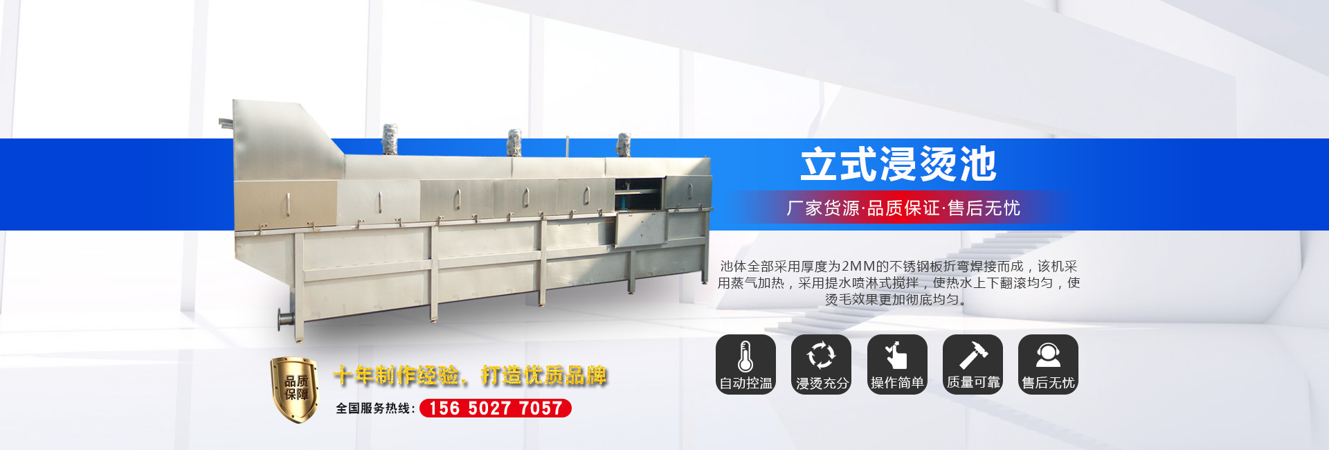 公司主要設備有:A字型立式脫毛機、臥式脫毛機、強力噴淋機、松毛機、浸燙池、螺旋預冷機、禽籠清洗機、電暈機、兔割前爪/后爪機、剝胗機、自動洗鉤機、螺旋燙爪機、雞爪脫皮機、分割輸送帶等屠宰用設備。
